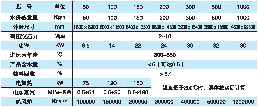 備注:1、水份蒸發(fā)量與物料的特性相關,本表蒸發(fā)量與溫度相關,數(shù)據(jù)僅供參考;
