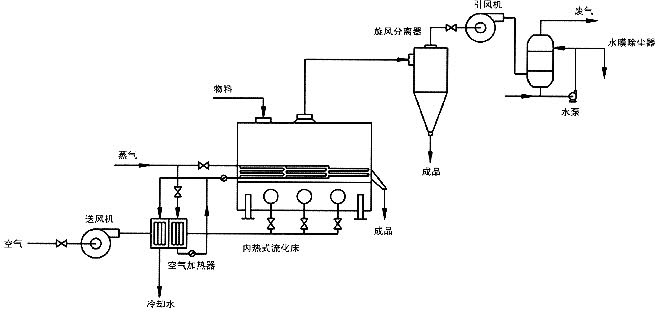 ◆ 內(nèi)熱式流化床干燥機(jī)是我廠與四川大學(xué)化工學(xué)院共同研創(chuàng)開發(fā)的斷一代高效節(jié)能干燥裝置。該裝置主要由內(nèi)熱式流化床、送風(fēng)機(jī)、引風(fēng)機(jī)、空氣預(yù)熱器、旋風(fēng)分離器和水膜除塵器等設(shè)備組成。環(huán)境空氣經(jīng)送風(fēng)機(jī)吹入預(yù)熱器進(jìn)行預(yù)熱,熱空氣流入流化床,氣固兩相在流化狀態(tài)下進(jìn)行接觸,傳熱傳質(zhì),完成對(duì)固體濕物料的干燥加工。濕物料通過加料機(jī)連續(xù)加入流化床,干燥產(chǎn)品從卸料口連續(xù)排出。廢氣經(jīng)旋風(fēng)分離器和水膜除塵器凈化后,由引風(fēng)機(jī)排出放空。它將內(nèi)加熱構(gòu)件埋置在流化料層中,物料脫水所需熱量分別由內(nèi)加熱構(gòu)件和流化用熱空氣提供。廣泛適用于精制鹽、純堿、過碳酸鈉、芒硝、氯化鉀、硝酸鉀、氯化銨等等物料的干燥和冷卻。