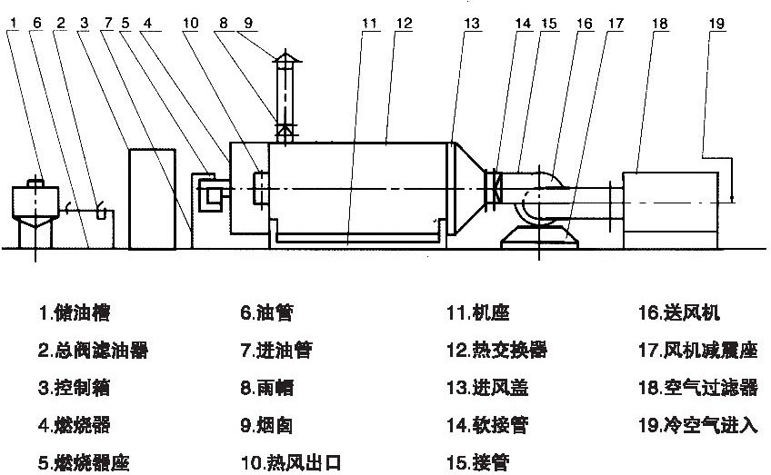 ◆ 燃料通過燃燒器燃燒,產(chǎn)生高溫燃氣。并借助具有強化換熱措施的熱風爐將高溫燃氣的熱量傳導給被加熱的空氣,高溫燃氣經(jīng)熱量散發(fā)后溫度將低至250以下由引風機排放大氣。需加熱的空氣通過選配的鼓風機送入熱風爐吸熱后,溫度升至額定值從熱風出口處送出。當熱風溫度達到額定的上限溫度時,燃燒器會自動停止燃燒或自動轉為小火焰燃燒;當熱風溫度降低到額定的下限溫度時,燃燒器又會重新點燃運行或轉為大火燃燒,升溫的速度可以調節(jié)進風閥的開度來實現(xiàn)。