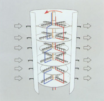◆ 物料沿指數(shù)螺旋線流經(jīng)趕走盤表面,在小干燥盤上的物料通過(guò)耙葉的翻抄被移動(dòng)到外緣,并在外緣落在正下方的大干燥盤外緣,在大干燥盤上的物料向里移動(dòng)并從中間落料口落入下一層小干燥盤中。大、小干燥盤交替排列,被干燥物料得以連續(xù)流經(jīng)整個(gè)干燥有效區(qū)。物料受熱均勻,無(wú)返混,無(wú)死角,終水分穩(wěn)定、一致。確保成品質(zhì)量。盤式干燥機(jī)中的關(guān)鍵部件耙葉、干燥圓盤,采用多道特殊的壓制、成型工藝,確保干燥效果和設(shè)備的正常運(yùn)行。對(duì)于有些地區(qū)一年四季氣溫變化及空氣相對(duì)濕度高等特點(diǎn),成品物料水分接近無(wú)水的要求,在盤式干燥的基礎(chǔ)上,輔以空氣加熱干燥并及時(shí)排濕的措施,避免了蒸發(fā)濕份冷凝回流,確保終水分一次性達(dá)到要求。